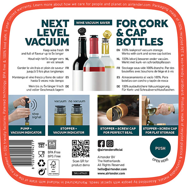 Cerchi una pompa per vino che faccia durare più a lungo il tuo vino? Airtender è la soluzione ideale, grazie alla sua chiusura ermetica che permette di conservare le bottiglie di vino anche in posizione orizzontale.