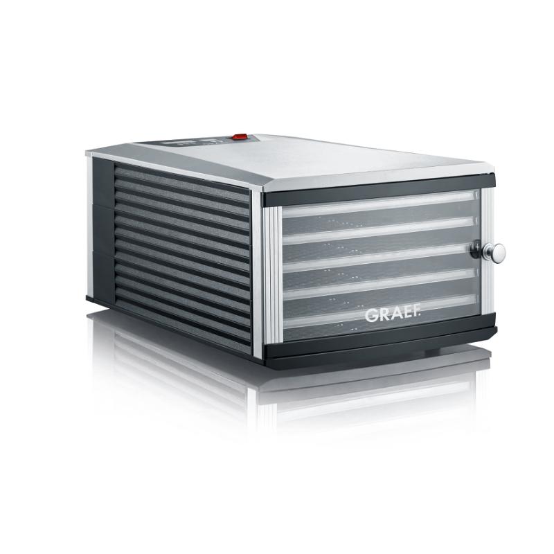 L’elemento riscaldante, la ventola e il termostato mantengono una temperatura stabile distribuita uniformemente in tutta la macchina. Il disidratatore è compatto, veloce e consuma pochissima energia, rendendolo adatto anche ai bar o alle cucine più piccole.